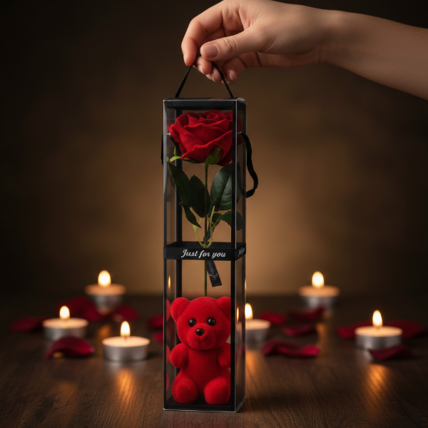 Ayıcıklı Şeffaf Kutulu Tekli Gül